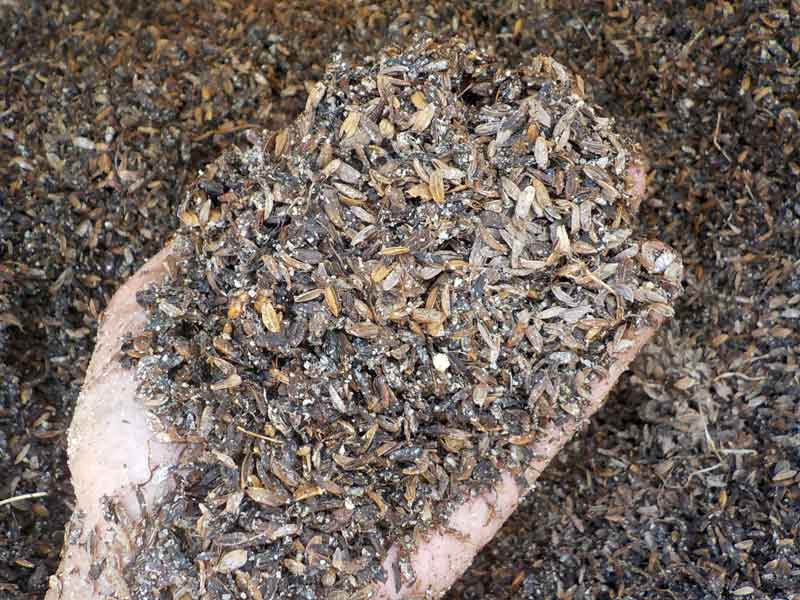 これはモミ殻に米ぬかと水を混ぜて堆肥にしたもみ殻たい肥。もみ殻には自然の納豆菌が付着しているので、菌に栄養と水をあげれば簡単に発酵が始まります。ただ、使い道がないので、屋外に野晒しで一年間放置してあります。