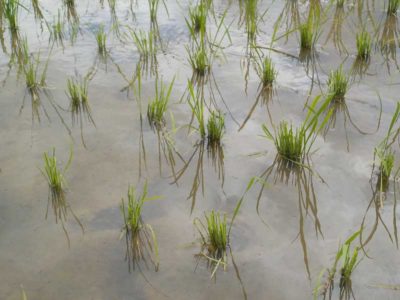 この時期の問題はというとシカで、分げつが始まって少し大きくなった苗を食べてしまいます。イノシシは足が短いので、水を張った田んぼにはまず入らないのですが、シカは1mぐらいの柵なら簡単に跳び越えて入ってきてしまうので、その対策をします。