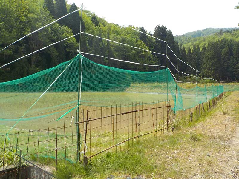 最低2.5mの高さまで紐や防獣ネットで田んぼをぐるりと覆います。これくらいの高さにしないと簡単に入られてしまうので、けっこう大変です。