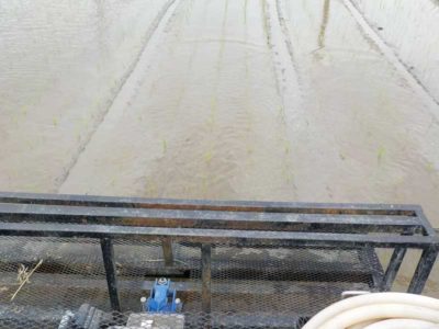 田植え後の初期の除草はチェーン除草。すだれ状のチェーンを管理機で引っ張ります。水をたっぷりと張り、チェーンを泥の中で泳がす感じで引っ張るのがポイント。主にヒエ対策です。