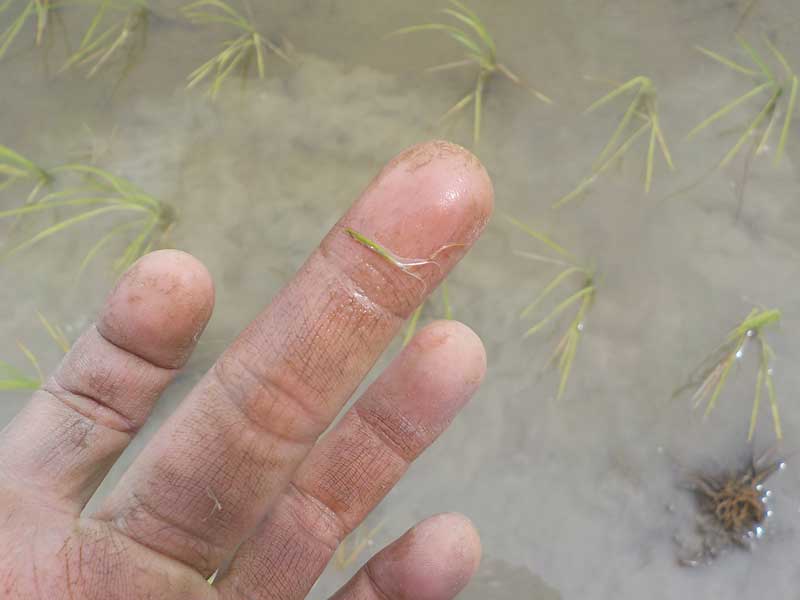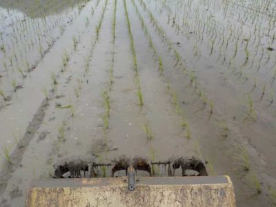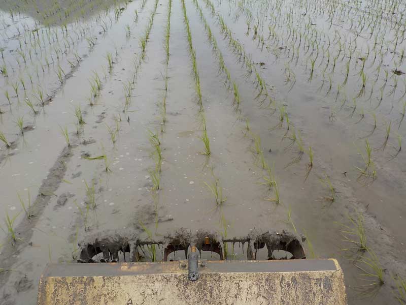 田植えから2週間ぐらいすると次はコナギという雑草が元気よく生えてくるので、今度は田んぼの水を抜いて中耕除草機で泥の中に埋め込んでいきます。チェーン除草で抜けなかったヒエも一緒に埋め込めるのと、稲の根に刺激を与えることができます。植物も人間と同じである程度の刺激やストレスが無いと立派に育ちません。ただ、この機械は手押しなので、田んぼの泥の中を歩かないといけないのがつらいです。