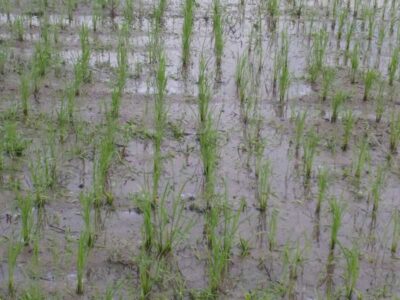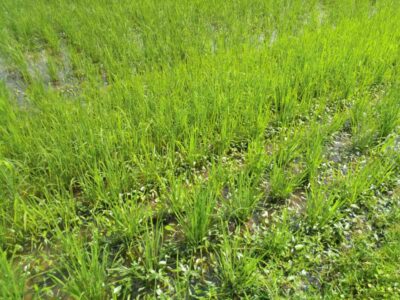 種と土と水があったら草は生えてくるので、田んぼも例外なく雑草だらけになります。数週間で稲があるのかわからないくらい。除草剤を使わない田んぼは何か対策をしていないと、雑草の種類は違ってもだいたいこんな感じなります。