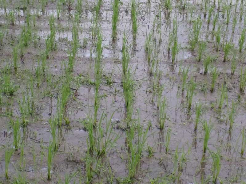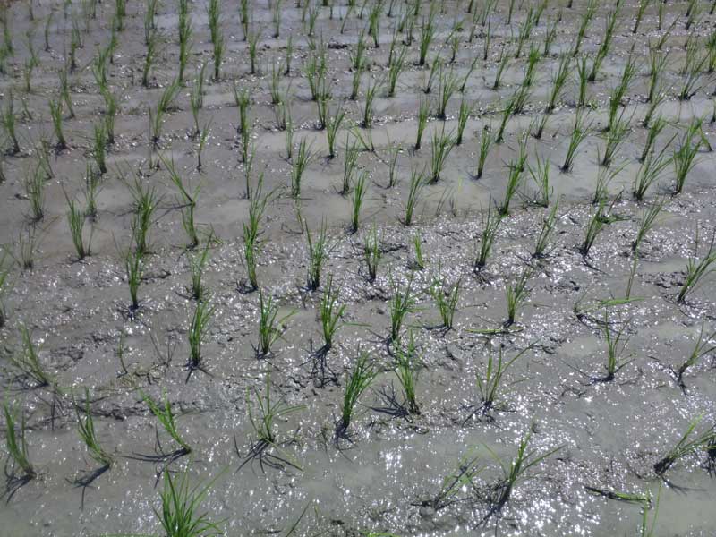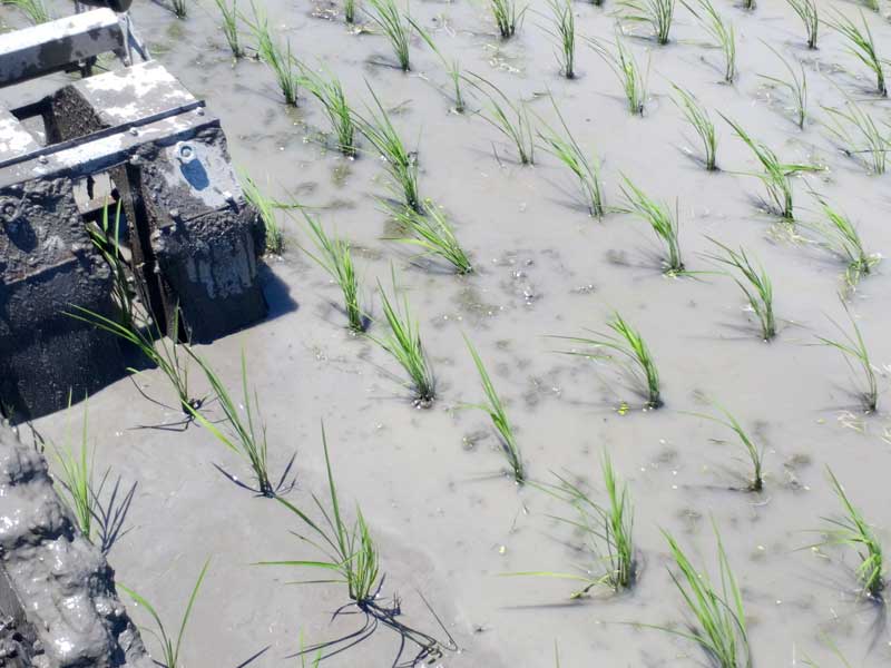 これくらい奇麗に埋め込んでも数日するとまた雑草は生えてくるので、稲が大きくなるまで何回か作業をします。稲が大きくなってしまうと田面には陽が差さなくなるので雑草も生長できない、という具合です。