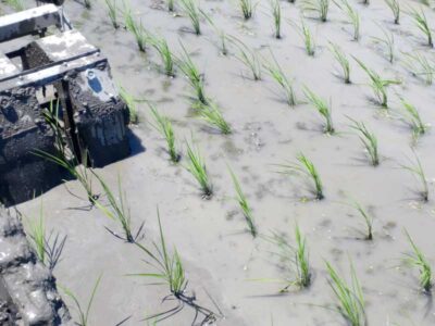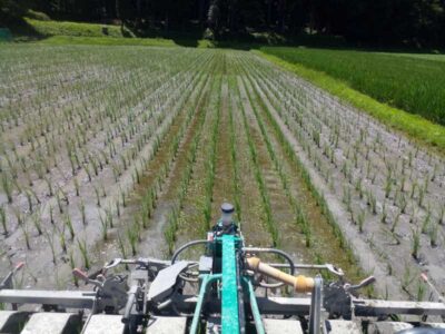 除草機で田植えと同じ要領で田んぼの中を回っていきます。雑草も小さいうちだと処理しやすいのですが、稲の苗も活着が悪いと一緒に抜けてしまうのでなかなかタイミングが難しい。