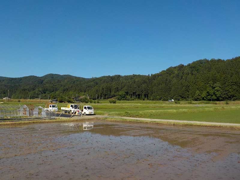 6月の田植え。雲一つない真っ青な空で異常に暑いです。一番最初の4月末の田植えの頃は10度以下の雨の中での田植えでしたが、この頃になると気温も30度近くになり、何もしなくても疲れます。田植えは一日中外作業なので、気温30度で朝から夕方までずっと日光を浴びているとヘトヘトになります。