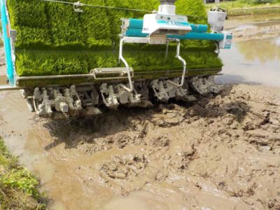 前半は順調でしたが、昼一番で田んぼの暗渠(あんきょ)に田植え機がはまりました。田んぼには排水性を良くするために、土の中に溝を掘って管が埋め込まれています。普通は問題なく通れるのですが、管が壊れてきたりすると稀に暗渠の溝にタイヤがはまります。だいたい片側のタイヤがはまって田植え機が傾いて完全に動けなくなります。
