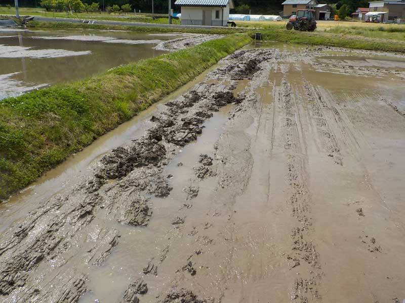 トラクターで引っ張って脱出できましたが、田んぼはグチャグチャ。今年から請け負う田んぼなので勝手がわからなく、かなり時間をロスしました。暗渠にはまったのは10年ぶりぐらいでしょうか。明日も別の新規請負の田んぼがあるので心配です。