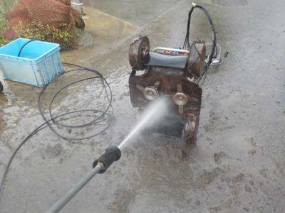 機械も水で洗えるものはきれいに洗って片づけをします。ほとんどの機械は次に使うのは半年後ぐらいになるので、洗浄後はグリス塗布やオイル交換など、またしっかり働ていくれるよう整備をしておきます。