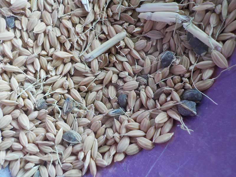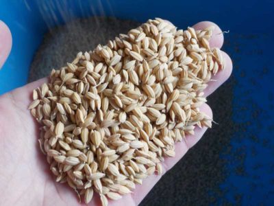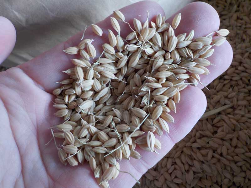 これが収穫後、乾燥だけをした籾です。ヒゲみたいなものがたくさんついていて、このまま使うと引っかかって邪魔になるのでこれを取り除きます。