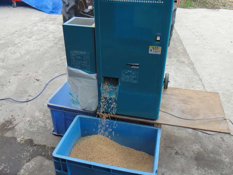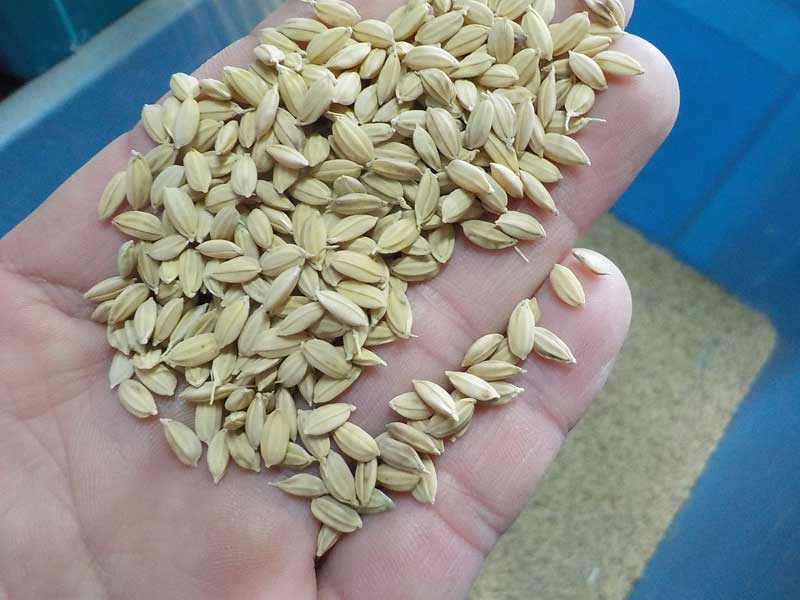 収穫しただけのモミなので、モミからヒゲみたいなものがくっついていたり、ごみや雑草の種が混じっていたりするのでそれを取り除きます。種子以外のものが混入していると、種蒔き時に邪魔になるのできれいにしておきます。