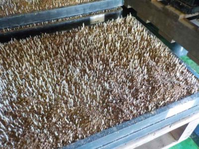 土からツンツンと白い芽が出てきたら外のビニールハウスへ移動です。ここから育苗開始です。