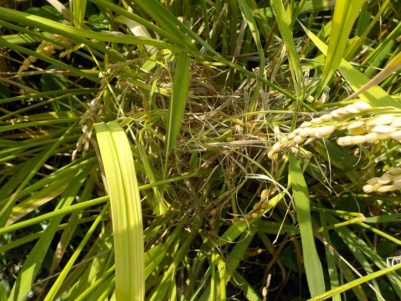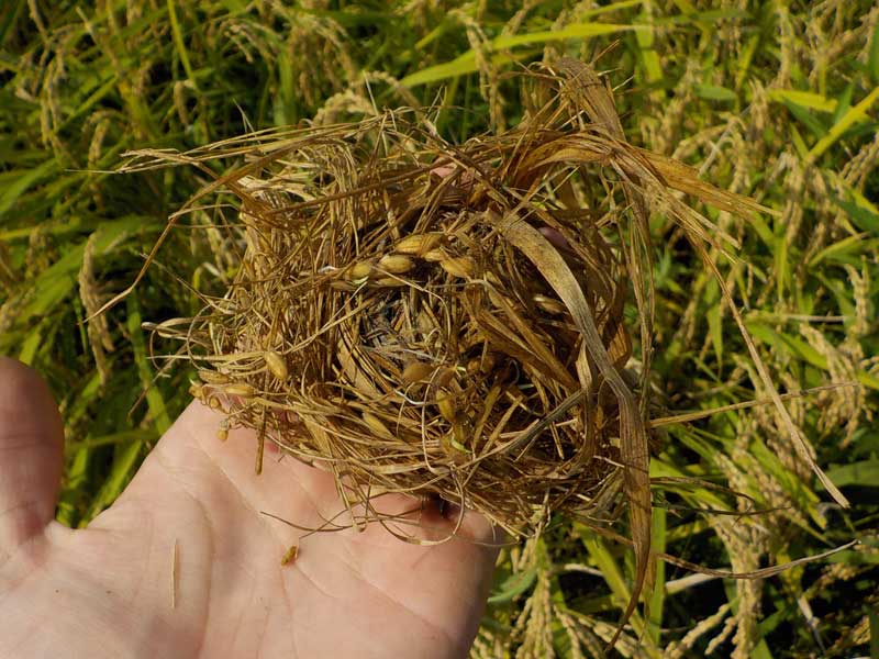暇なので田んぼの稲を見ているとネズミの巣を発見。