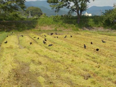 稲刈り後は鳶やカラスが寄ってきます。田舎のカラスはカエルや昆虫、稲の落ちモミまで食べます。