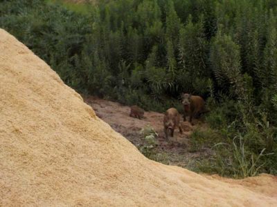 モミすりで排出したモミ殻に交じっているお米を食べているみたいで、毎日のように山からやってきます。10月も過ぎると食べるものもなくなってしまうので、この時期の動物はかなり貪欲です。