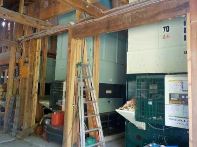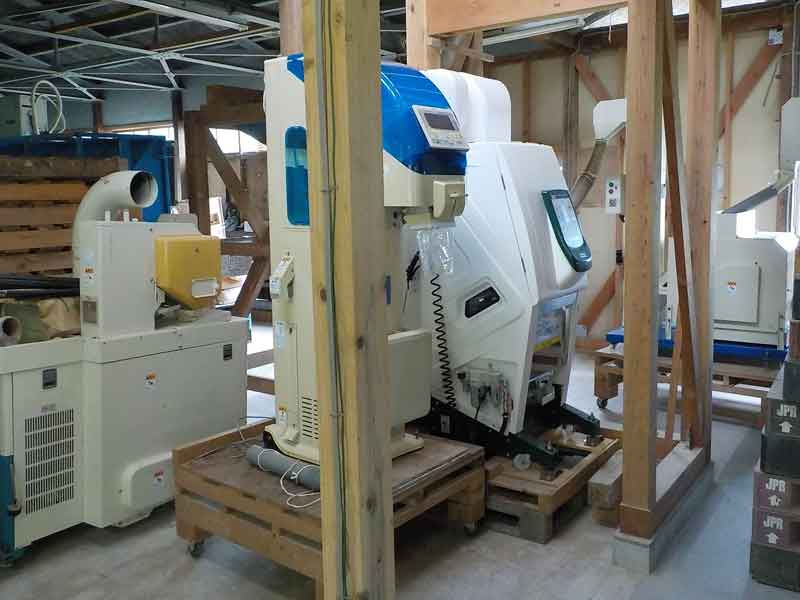 清掃が終わったら機械を所定の場所に配置します。各機械のお米の出入り口は全部パイプなどでつないで、収穫後の籾(殻つきのお米)が綺麗な玄米になるまでの1つのラインを作ります。