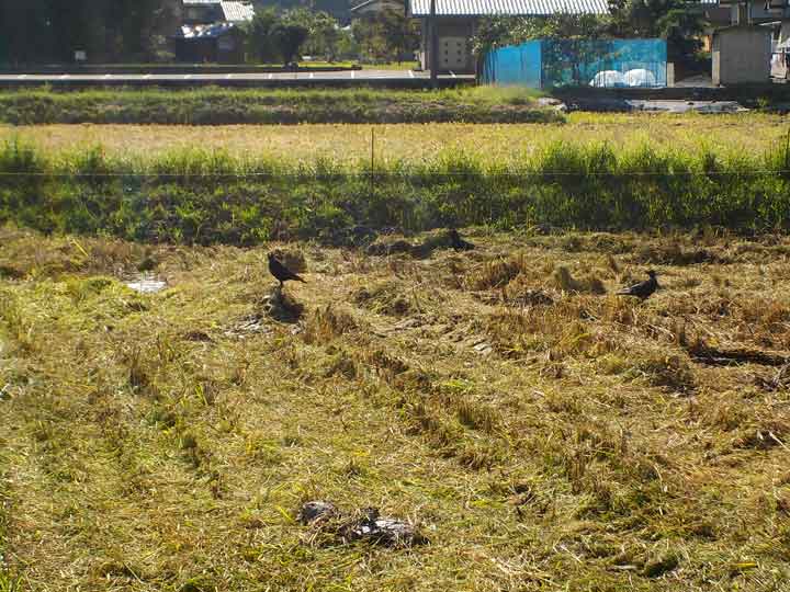 そして、カラス。田舎のカラスは田んぼんでも餌を探します。いつも単独ではなく集団でやってくるので、体の大きいトビなどにも負けずに縄張り争いをしています。