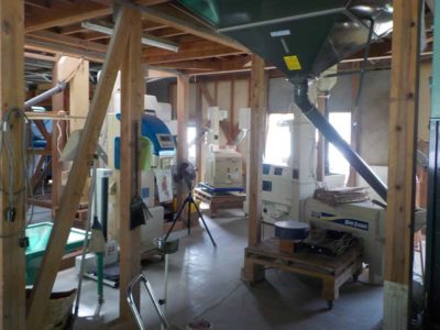 全部の機械の清掃が終わったら、乾燥機から袋詰め用の機械までを接続し、1つのラインを作ります。そして一番緊張する動作チェック。一年ぶりに使用する機械なので、稀にスイッチを入れても”動かない”ということがあるので、何事もなく動いてくれると安心します。雑用係の自分はこれから2か月間、稲刈りの手伝いはせず、この施設での収穫後の作業がメインになります。