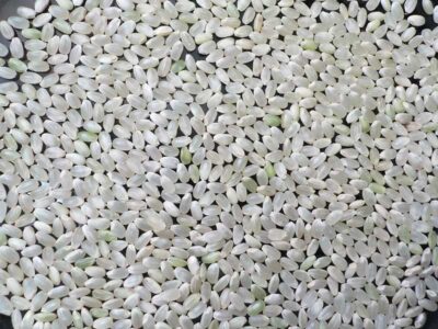 8月の高温期に成熟したお米はとにかく白いお米が多いです。いわゆる「乳白米」で、デンプンの代わりに空気が多く入ってしまったお米で、高温障害に遭った代表的なお米です。炊くと崩れやすいです。選別をしても取り切れないくらい混じっているのでどうしようかと思っている次第です。