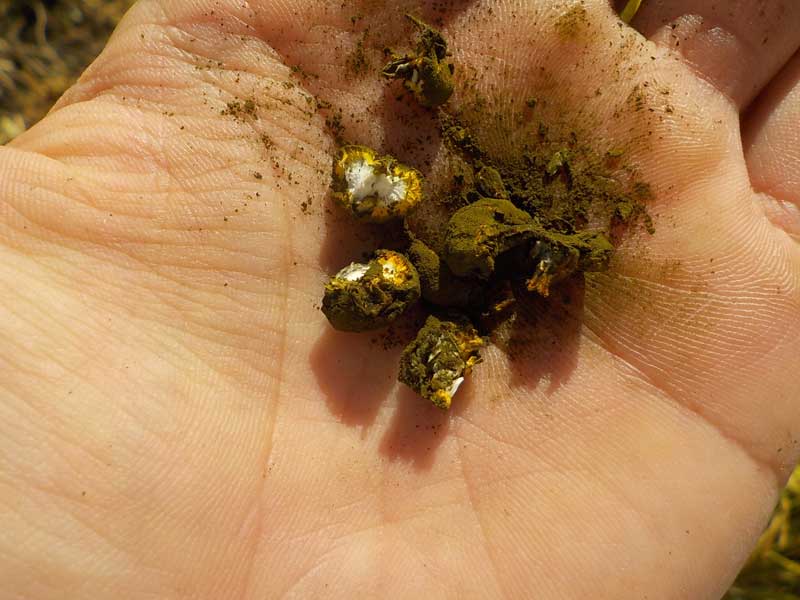 稲穂に出来る病粒で、こうじ菌に感染することで発病します。「稲こうじ病」と呼ばれるもので、何年かに一度発生する珍しい病気です。地域性もあって、一度も発生したことのない場所では全く見かけません。