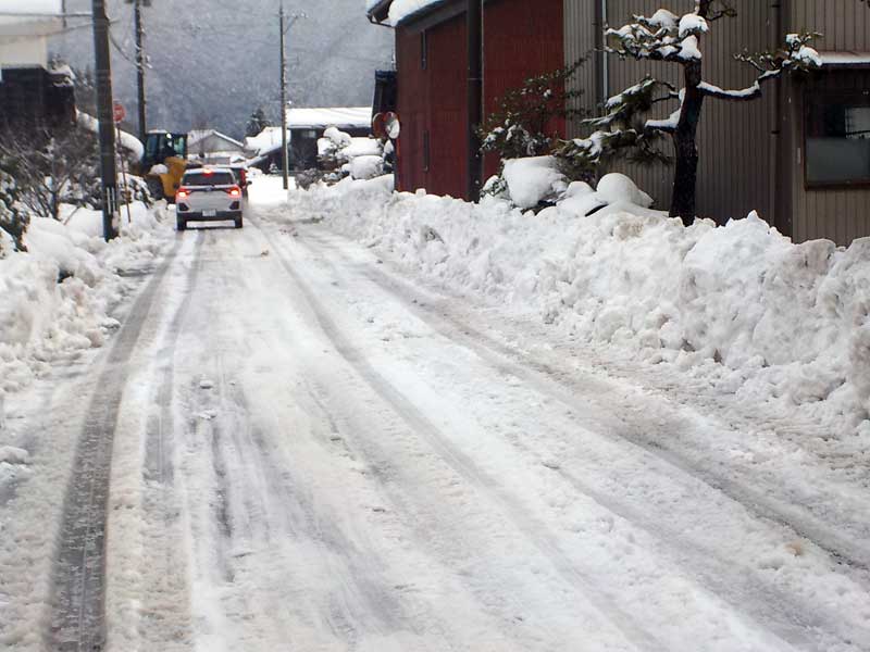 道路もグチャグチャ。除雪で道路わきに1mの壁が出来ていますが、最後はこれを人の手で片付けます。そうしないと自分の家への出入りが出来ないので、除雪車が通るたびに雪除け作業です。