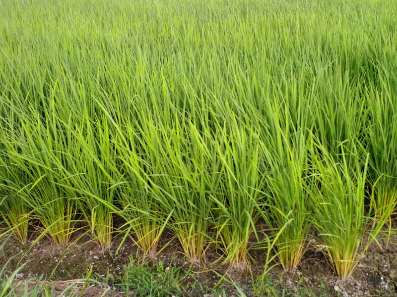 田植え時には1~3本ぐらいだった苗も本数が増え、かなり大きくなりました。これくらいになったら田んぼの水を抜いて乾かしていきます。これからは畑の水分ぐらいで、稲の根にも充分に酸素が行き渡るように管理していきます。