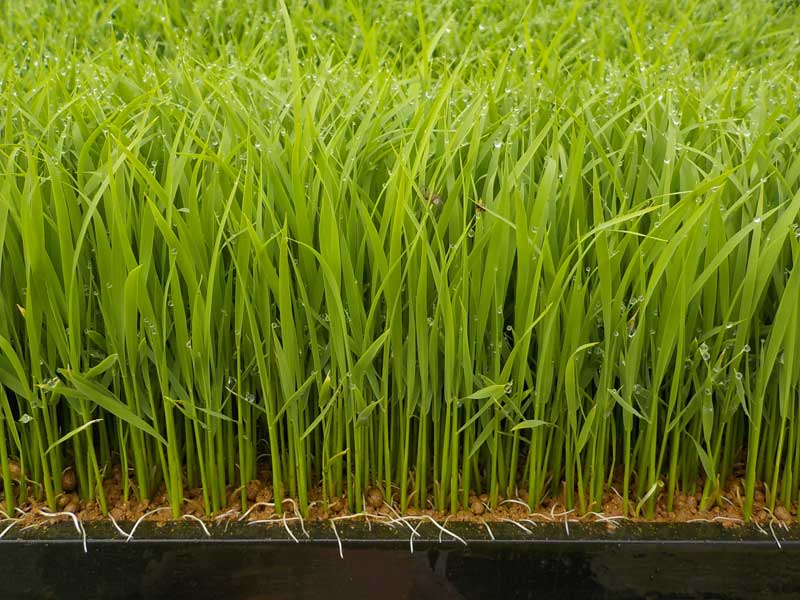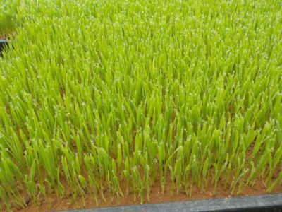 こちらは先日ビニールハウスに出したばかりのコシヒカリの苗。この苗はここまで全く農薬を使っていないので、プールに水を張るまでは温度管理にかなり気を使っています。