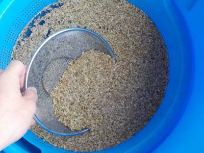 機械の準備と併せて種の準備も進めていきます。種子選別の定番になっている塩水選。自分は10年ぐらい毎年この作業をやっていますが、最初の頃はよく失敗をした思い出があります。