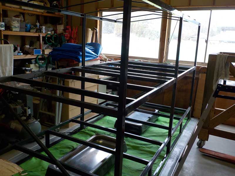 これは育苗箱にまいた種を出芽(土から芽を出すこと)させるための発芽器のフレームです。これも育苗期間中しか使わないので、ほぼ一年間バラバラにされて倉庫で眠っています。使用前に組み立てて、最後に保温シートを掛けて完成です。
