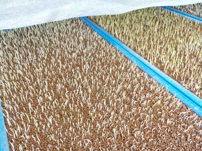 これは種もみと根が土から飛び出してしまったものです。有機肥料入りの床土を使うと発芽障害に遭いやすいので、このように飛び出してしまいます。この程度ならプールに浸けてしまえば落ち着くので問題なしです。
