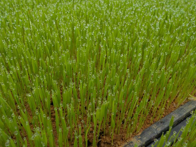 何故か直立しているもち米「タンチョウモチ」の苗。苗の勢いが違います。これから育苗期間中も暑くなるので、床土は覆土だけ有機肥料入りで下土は無肥料です。あとで追肥します。初期の肥料を減らさないと有機肥料でも効きすぎてしまうので、ちょっと手間ですが工夫しています。