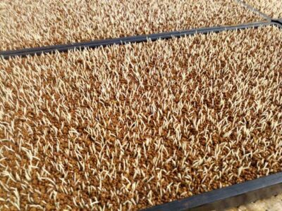 ちょっとバタバタしているうちに種まきまで終わってしまって、今日から本格的な育苗の開始。まずは芽の出た苗箱を、この前シートを張った育苗ハウスに並べていきます。