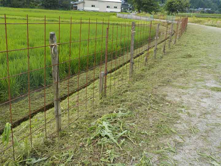 電気柵は支柱だけなので割とマシ。ですが、こまめに草を刈らないと線に草がすらえて出力が下がってしまいます。