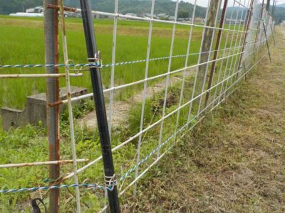 電気”柵”といっても2~3本の電線で農地を囲うだけなのですが、動物に対してはかなりの効果があります。さらに電気柵の内側に防獣ネットやワイヤーメッシュなどで一度にすり抜けられないようにするとほぼ完璧です。デメリットとして、雑草が電線に擦れると漏電してしまうのでこまめな除草が必要です。山間の田んぼだと電気柵はほぼ必須で、これが無いと収穫できる稲も数日で無くなります。それくらいイノシシの被害は大きいです。