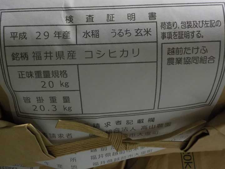検査証のついた袋にお米を詰め、検査場に運びます。検査場でお米の検査を受けて、お米の内容証明の印を押されたら「平成29年度産 福井県産コシヒカリ」が販売可です。それまでは「複数原料米」表示での販売をしないとダメということになっています。