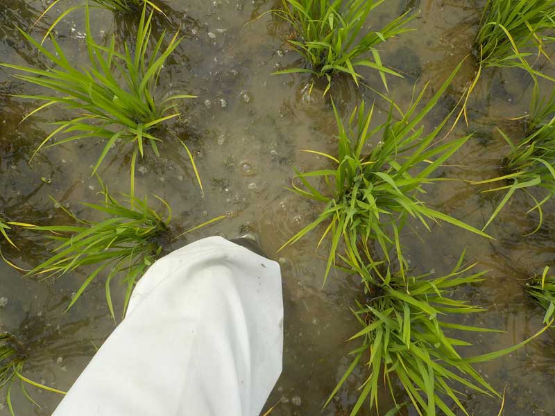 また、田んぼが大きすぎると田んぼの周囲からは届かない場所があるので、その場合は田んぼの中を歩いて散布します。これが一番きついです。荷物は重いし、足元はひざ下まで泥、おまけに暑いので、1回田んぼの中で散布しただけで汗びっしょりフラフラになります。早くドローンで散布できるようになってほしいです。