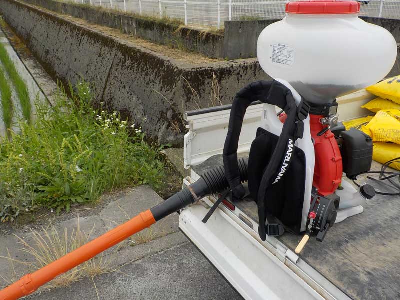 こんな機械に肥料を入れて、これを背負って田んぼの周囲から風の力で飛ばして散布します。肥料がだいたい20kg、機械が10kgぐらいあるので、暑さと重さでこの時期の作業はつらいです。