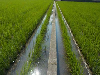 コンクリートの畦(アゼ)の上を歩きながら散布するのは落ちそうで怖いです。草刈りをしなくても良いコンクリートのあぜ道ですが、この作業の時だけは大変です。