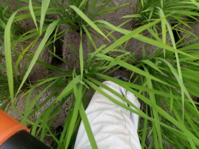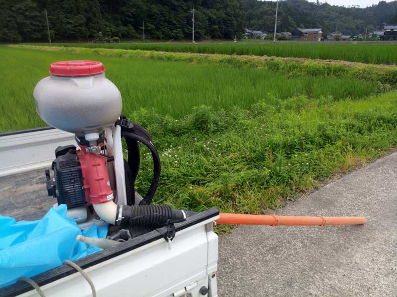 そろそろ稲の生長が止まって穂を作る準備を始めるので、追加で肥料を散布します。写真のような機械に肥料を詰め、これを背負って田んぼの周囲を歩きます。風の力で肥料を飛ばす散布機なので結構広範囲にバラまけるのですが、