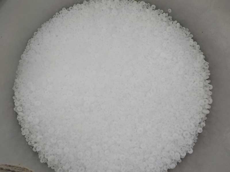 硫安の粒。理科の実験で使うような”正に”化学物質という感じで、チッソの塊です。有機肥料のような強い臭いもなく、軽く、少量でも良く効きます。科学技術の進歩の賜物でとても便利ですが、これをこの時期に稲に与えてもおいしいお米にはなりません。お米の食味を上げるには適期の有機肥料の穂肥が必要だと思います。