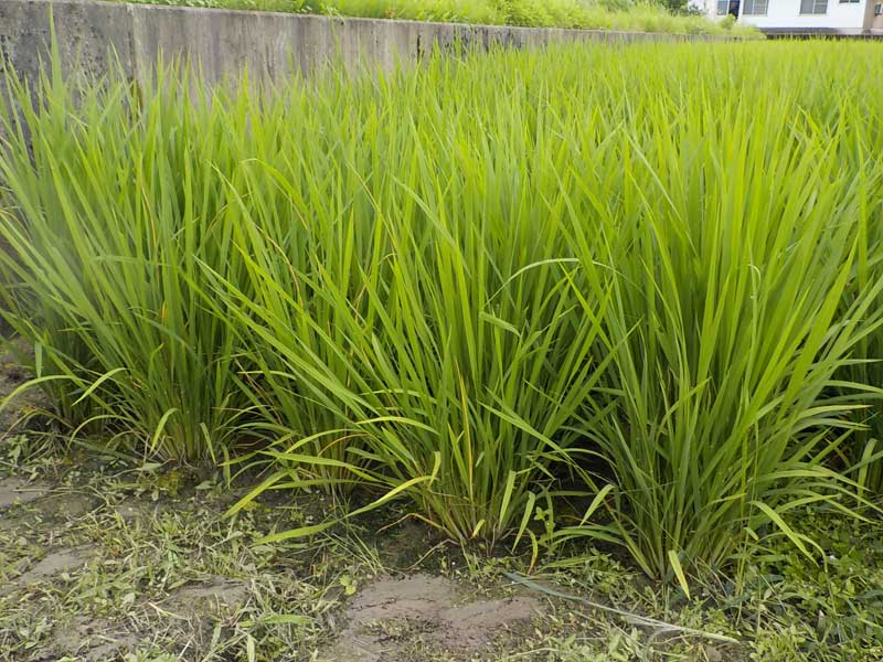この品種は4月末に植えた日本晴という品種。お盆前には出穂予定で、やや茎がふっくらしてきました。雨の多い日が続くので追肥をするか考えたのですが、急に稲が色あせてきたので少し遅いのですが追肥をすることしました。