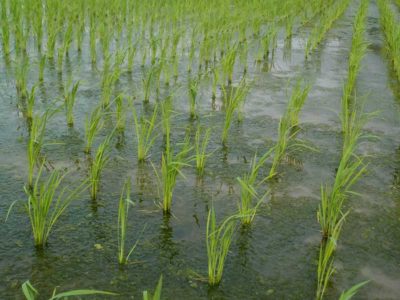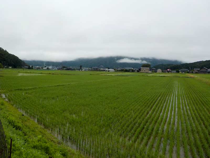 ちょうど1ヵ月ほど前に植えたコシヒカリの苗。田んぼは藻でひどいことになっていますが今のところは順調。まだ葉が柔らかいので、この長雨だといもち病にならないかが心配です。