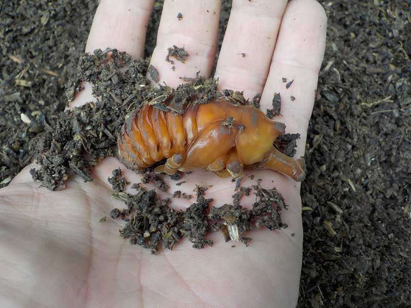 昨年11月頃にもみ殻の山の中にいたカブトムシの幼虫ですが、今日掘り起こしてみたらサナギになっていました。幼虫とは全く形状が異なるので不思議です。