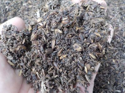 半年前はまだふかふかの”もみ殻”といった状態でしたが、半年ほどでボロボロになって半分”土”のようになってきました。昆虫の幼虫やミミズに食べられて、その糞と土が混ざったものです。これが本当の意味での”土づくり”で、こういった無数の小さな生き物の力で”土”が出来ていきます。毎年秋に”土づくり”ということでいろんなものを田んぼに撒いていますが、あれは微生物やこういった生き物の餌で、その餌と一緒に稲ワラをバラバラに分解して土が作られるという仕組みです。
