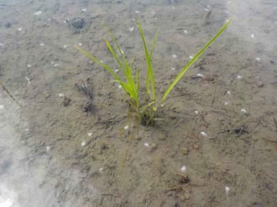 植えた直後は3本ほどの苗ですが、稲は生長が進むとこれが20本以上に増えます。ちなみに苗の周りの白い粒が除草剤です。魔法の粉で、たったこれだけで田んぼに一切雑草が生え無くなります。無農薬栽培をやったことのある農家さんなら身に染みてわかると思うのですが、稲作革命と言っていいほど本当にすごい薬だと思います。