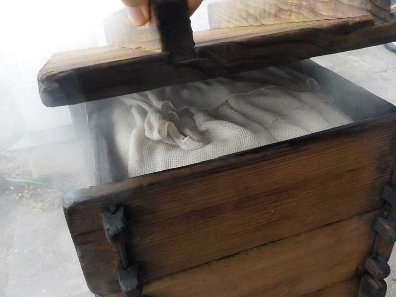 餅に使うもち米は炊かずに蒸します。もち米は水分を吸うとどんどん柔らかくなるので、蒸すことで柔らかくなりすぎるのを防ぎます。