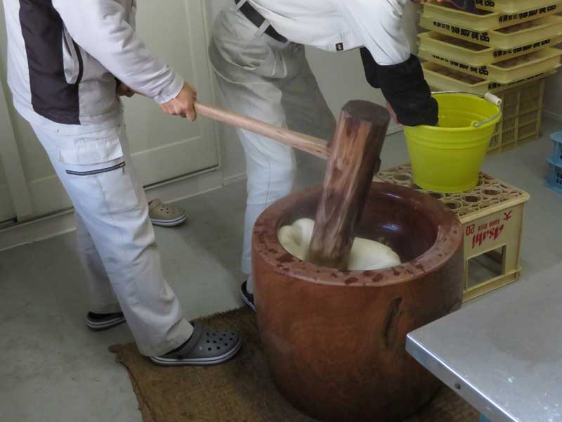 蒸したもち米は杵と臼を使って搗き上げます。ご飯粒を潰しながらモチにしていくことによって、モチ本来の力強りコシと粘りが生まれます。粉砕したもち米を捏ねただけだと、柔らかいトロトロのお餅になってしまいます。