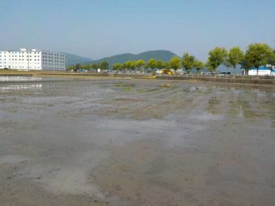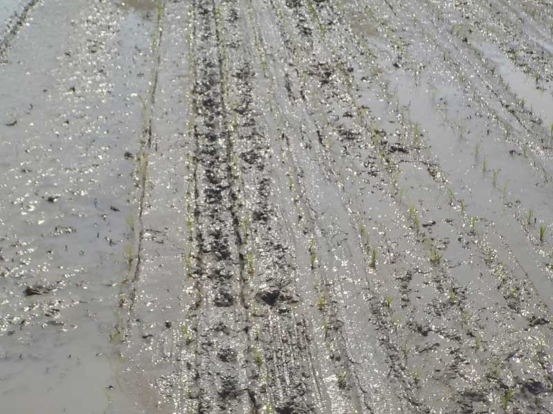 川沿いの田んぼは砂地なので、粘土とは違って土がよく締まります。田んぼの水を落として半日で田植え機のタイヤの跡がつくぐらいです。ちょうど片栗粉を水に溶かしたような土の状態で、水の中で沈殿した片栗粉がカチカチに固まったような感じになります。