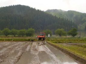 今日から皆様にお届けする用のお米の田植えを行います。本日は収穫期が遅い「にこまる」「タンチョウモチ」「古代米」の3種5品目を植えます。