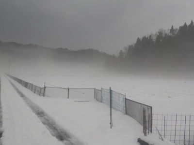 日中は暖かいので雪の水分が蒸発し、翌朝になるとその水分が寒さで霧になって現れます。雪が積もっている地表部に近い部分に濃く現れるのが特徴的です。雨が降っているとこの濃い霧がずーっと消えないので1日中真っ白という日もあります。
