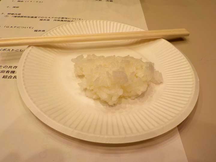 来年、平成30年にはコシヒカリの次を担う福井の新品種が登場予定ですが、これはその試食です。食べた感じは甘みの強い「あきさかり」です。ごはんだけだと後味が悪いくらい口の中に甘みが残り、個人的には苦手な味です。おにぎりや焼飯、混ぜご飯など加工品に向いていそうな感じがします。炊飯してから半日以上たった状態でどのような食感なのかが気になります。